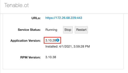 Note: All OT Security and OT Security Sensor upgrades are staged when you install all updates. The upgrade is not yet installed. Click on one of the OT Security tabs, then click the blue arrow next to RPM Version. (As outlined in the following procedure.)