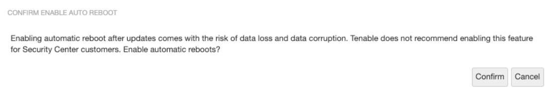 There are risks associated with automatically rebooting after updates. Scheduled automatic reboots risk disrupting an ongoing system task (scanning, exporting, importing, etc.) and also cause harm to the system in some rare cases. Tenable Core includes several warnings and pop-up modals to confirm enabling this feature. Ensure that automatic updates and scheduled scans are not both scheduled within the same general timeframe.