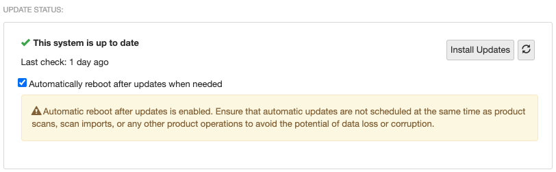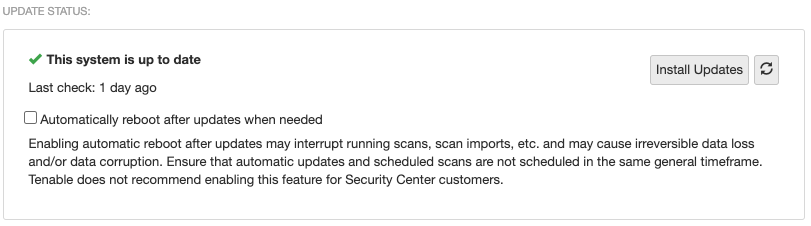 There are risks associated with automatically rebooting after updates. Scheduled automatic reboots risk disrupting an ongoing system task (scanning, exporting, importing, etc.) and also cause harm to the system in some rare cases. Tenable Core includes several warnings and pop-up modals to confirm enabling this feature. Ensure that automatic updates and scheduled scans are not both scheduled within the same general timeframe.