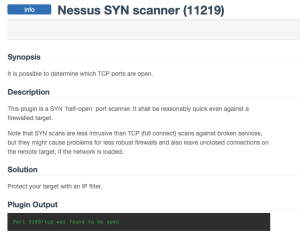 There are a variety of methods that can be employed to assist organizations with port filtering, or determining if host-based firewalls are in use. Nessus has a variety of scanning methods to detect open ports and services. The Nessus SYN scanner, plugin ID 11219, is less intrusive and behaves differently by simplifying the scanning process. The scanner sends packets and waits for a response, but does not initiate the full three-way handshake. It does not open sockets, but generates raw packets using low-level libraries.