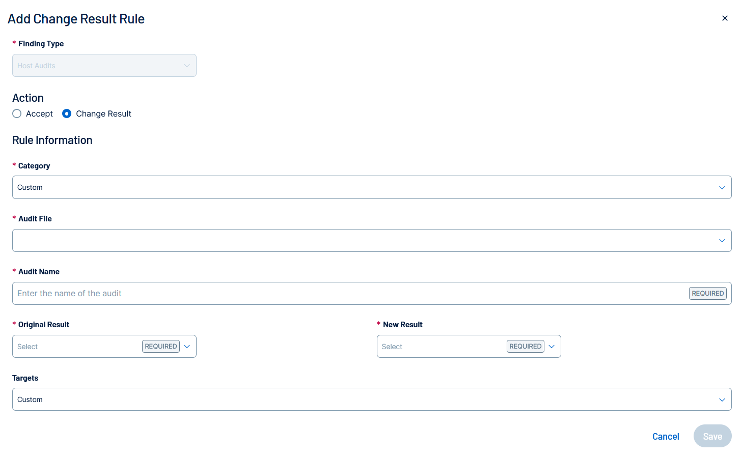 Change Result | In the Host Audits tab, change the Original Result of host audit findings, for example, by changing Failed to Passed. |