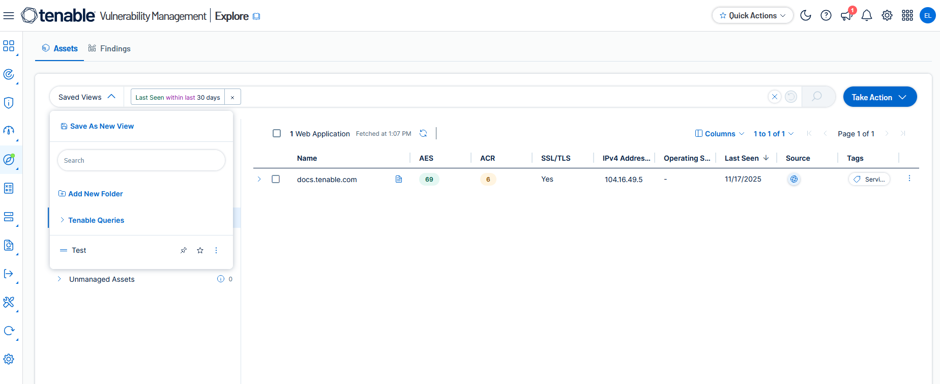 Explore section in Tenable Vulnerability Management is the central location for all your scan data. In Explore, you view and manage: