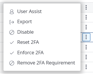 On the right side of the row for the user for which you want to reset two-factor authentication, click the  button. button.A menu appears.