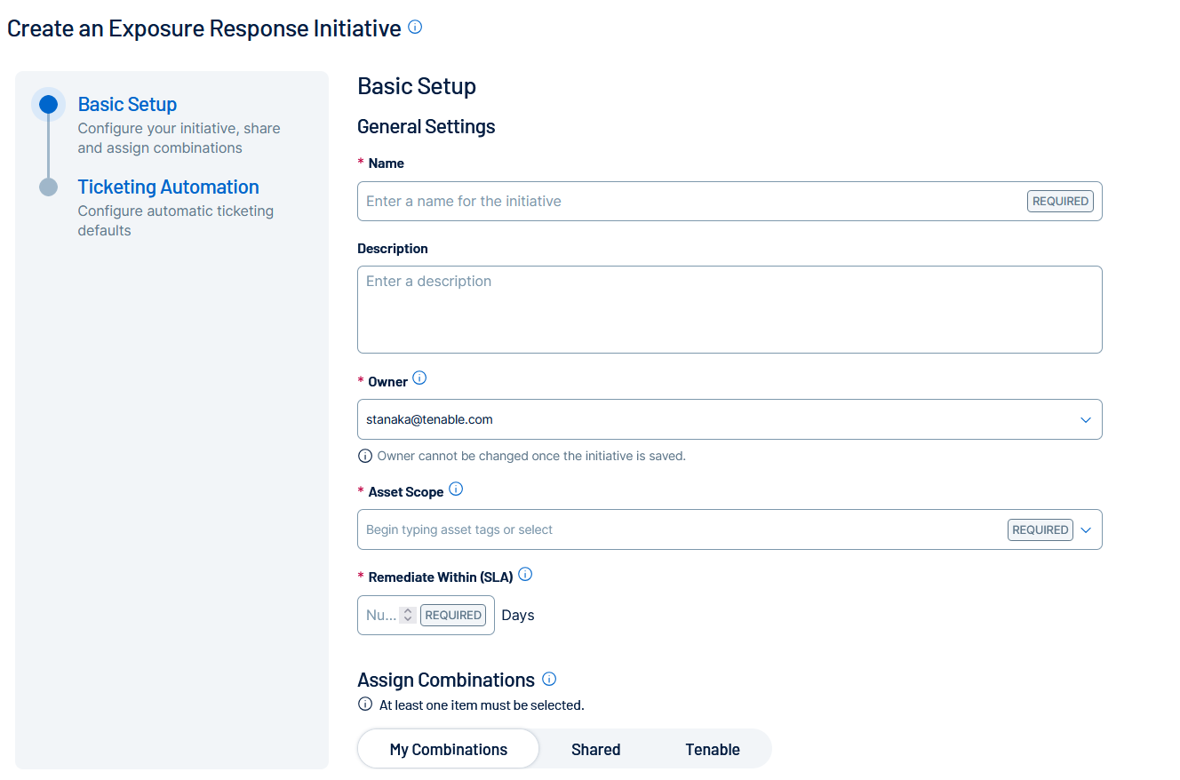 Option Description Name (required) Type a name for the initiative. Description Type a description for the initiative, for example Reduce my external attack surface. Owner Select the initiative owner from a list of [MadCap Variable: Tenable.VulnerabilityManagementStandalone] users. You cannot reassign initiatives once you create them.