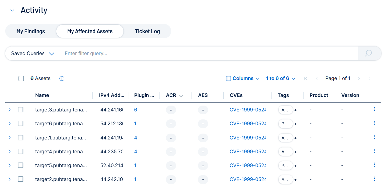 The Activity section organizes your remediation data across three tabs: My Findings, My Affected Assets, and Ticket Log. Data on the My Findings and My Affected Assets tabs can be filtered using the Query Builder, saved as Saved Queries, and then exported. The Ticket Log tab The Ticket Log tab shows the status of all tickets generated against the initiative.