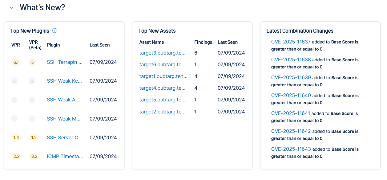In the What's New section, you can view how an initiative has recently changed. These updates can include new findings, new affected assets, and new CVEs (Common Vulnerabilities and Exposures) that the combinations bring into scope (for example, a CVE whose VPR increased).