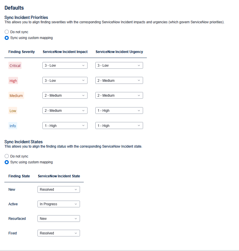 Important! You must successfully connect the integration before you can proceed. - Configure the following default values for synchronizing ServiceNow Incident Priorities and Incident States: