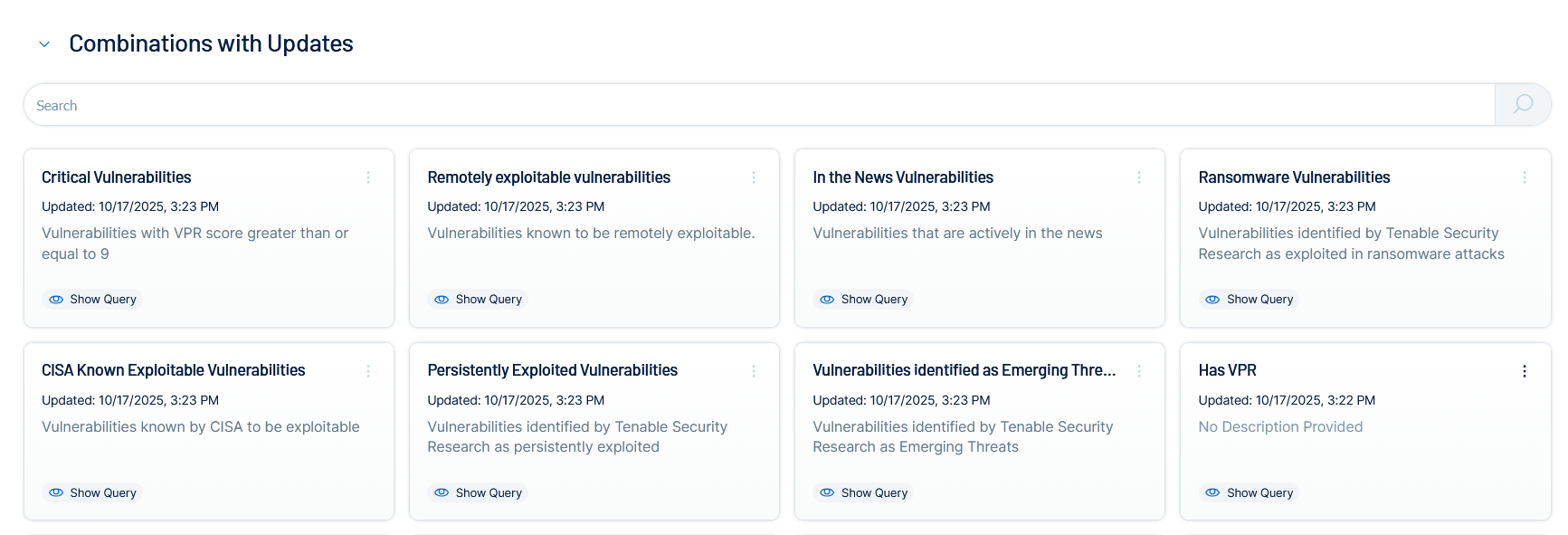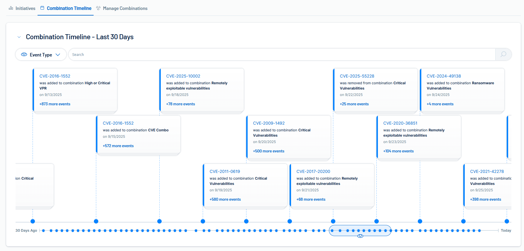Combination Timeline tab, you can view a 30-day timeline of combinations added to or removed from the initiatives you have access to. You can also view new combinations added by the Tenable research team.