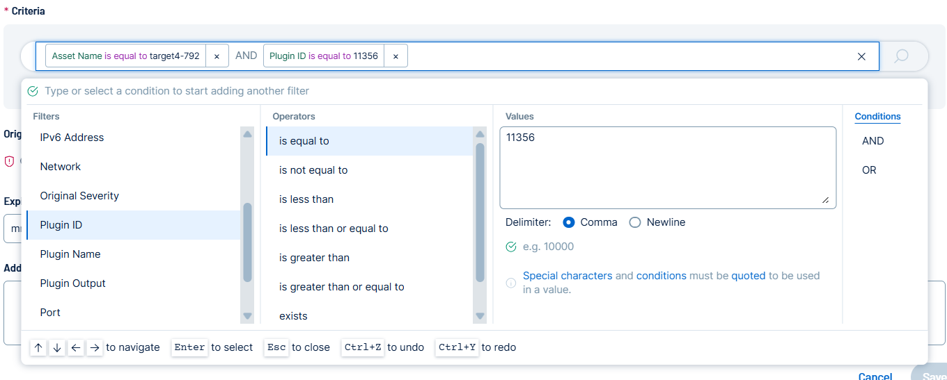 Configure the following options: Option Description Action (required) Click Accept or Recast. To learn about these rule types, see About Recast and Accept Rules. Name (required) Type a name for this recast rule. Description Type a description for this recast rule. Criteria (required) Use this query bar to define the precise set of assets and/or findings to which this Recast rule will apply. You can construct a query using filters available in Recast Filters such as IPv4 Address, Plugin ID, FQDN, and Tags. When you select a filter, you can select the desired Operator and Values for your query. As you build your query, the system provides dynamic, real-time feedback by automatically displaying the exact number of Assets and Findings that match your specified criteria, allowing you to accurately scope your rule before final submission. These values appear in the Current matches to entered query below the Criteria query bar. Tip: For more information on tags and how to create and manage them, see Tags.Tip: Use the AND / OR boolean operators to apply multiple filters to the rule.Original Severity Shows the original severity identified by Tenable Vulnerability Management. New Severity (Recast rules only) Select the severity you want to change the corresponding vulnerability to, for example Low. Expires Type a date when the rule will expire or click the  icon and select a date. icon and select a date.Additional Comments Type comments to provide rule details. Report as false positive to Tenable (Accept rules only) Turn on this toggle when a plugin generates inaccurate findings and you want Tenable to review the results.