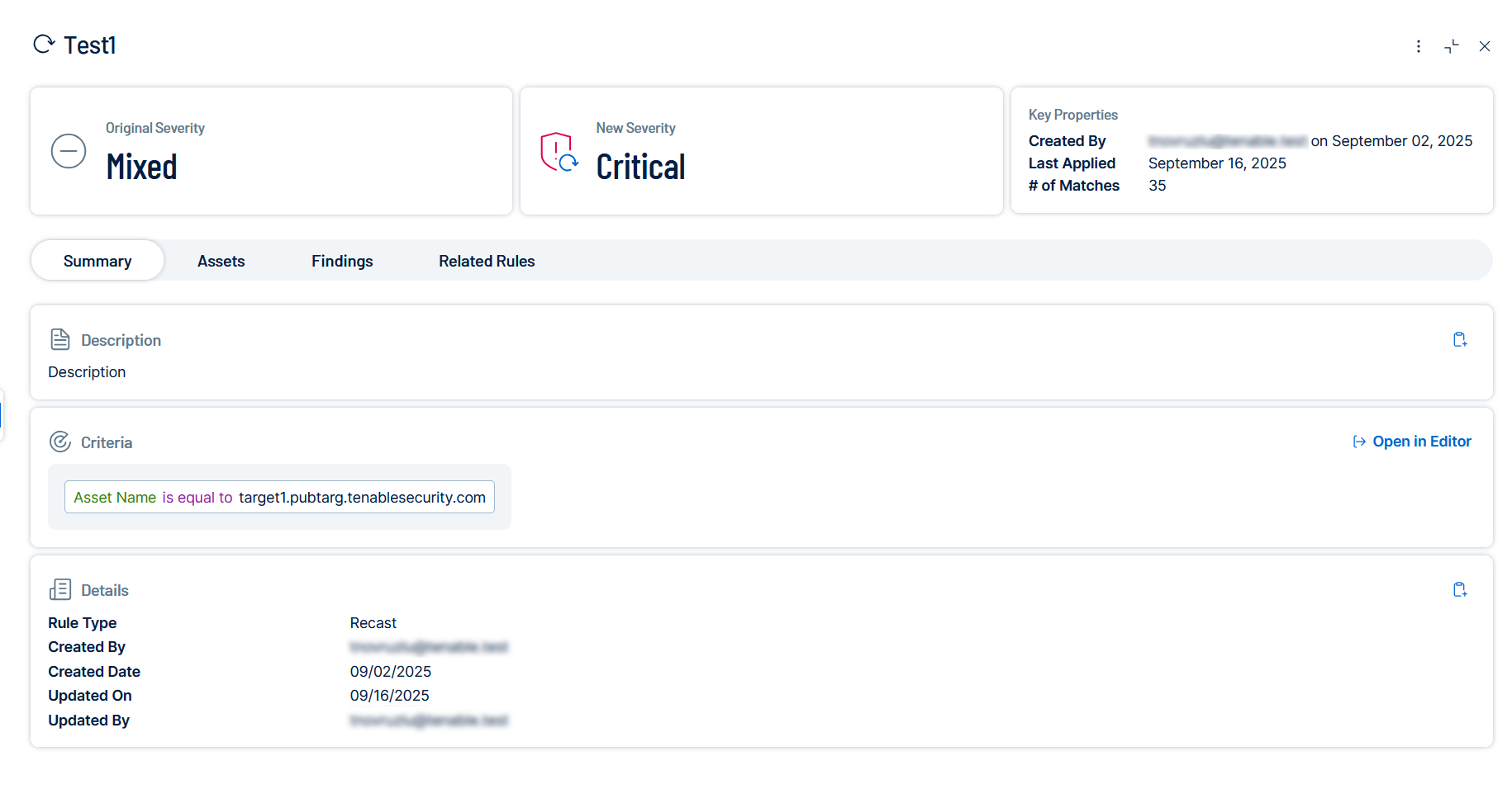 The updated severity defined by the recast rule. Values are Critical, High, Medium, Low, Info. |