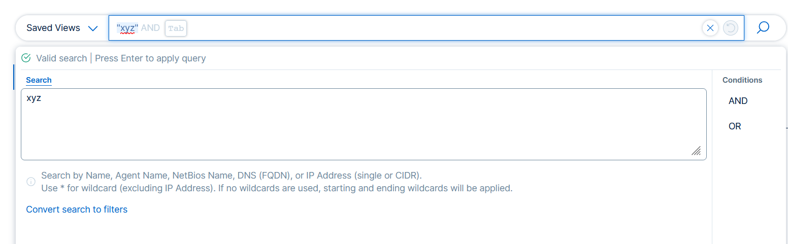 Agent Name is equal to *xyz* OR DNS (FQDN) is equal to *xyz* OR Asset Name is equal to *xyz* OR NetBIOS Name is equal to *xyz*