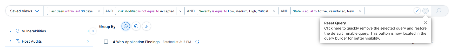 button inside the query builder.This clears the current query and applies the default query set by either the user or Tenable. If there is no default query, then this will apply an empty query.