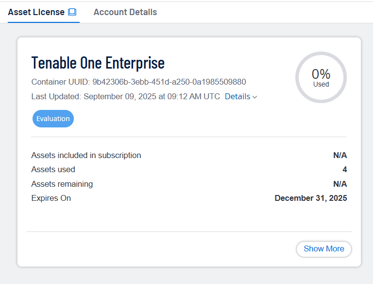 View information about your Tenable licenses in the Asset License tab, which appears by default when you open the License Information page. The Asset License tab shows license usage for products in the current Tenable container. Details appear in panels, separated by product.